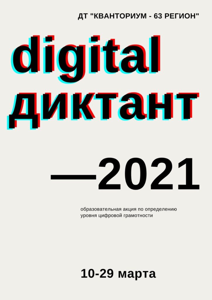 Рады вам сообщить, что с 10 по 29 марта в детском технопарке «Кванториум — 63 регион» пройдет Digital Диктант – образовательная акция по определению уровня цифровой грамотности!