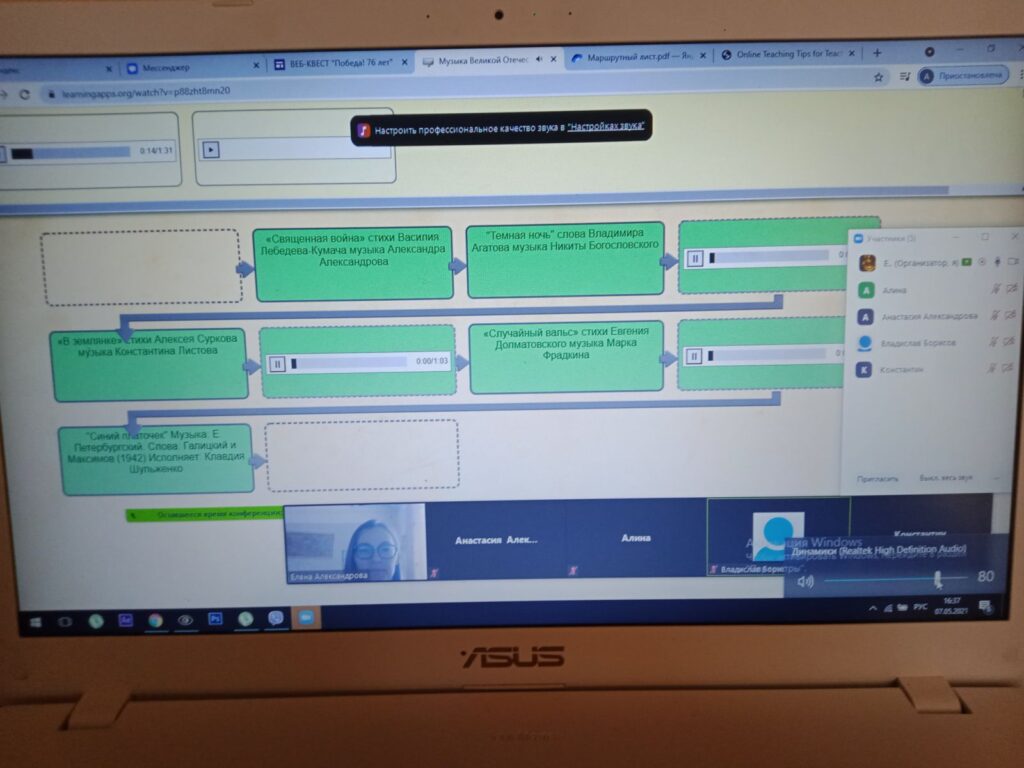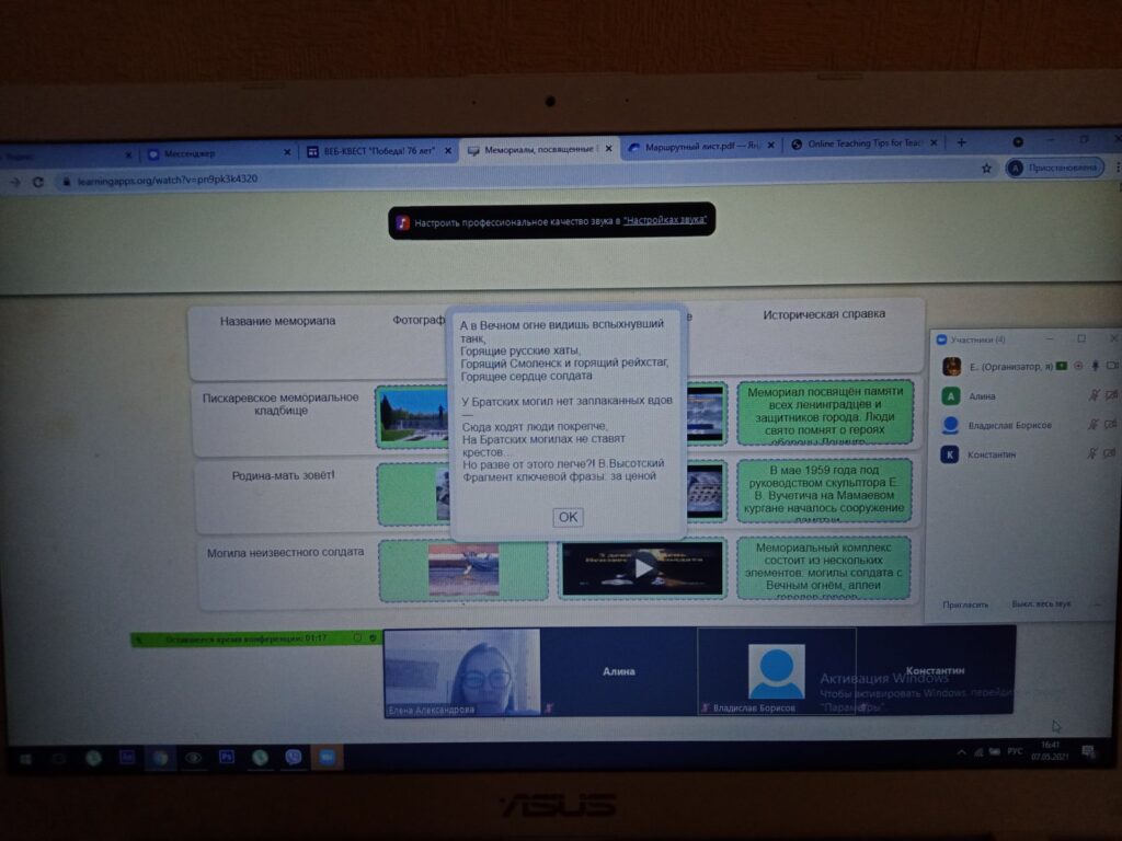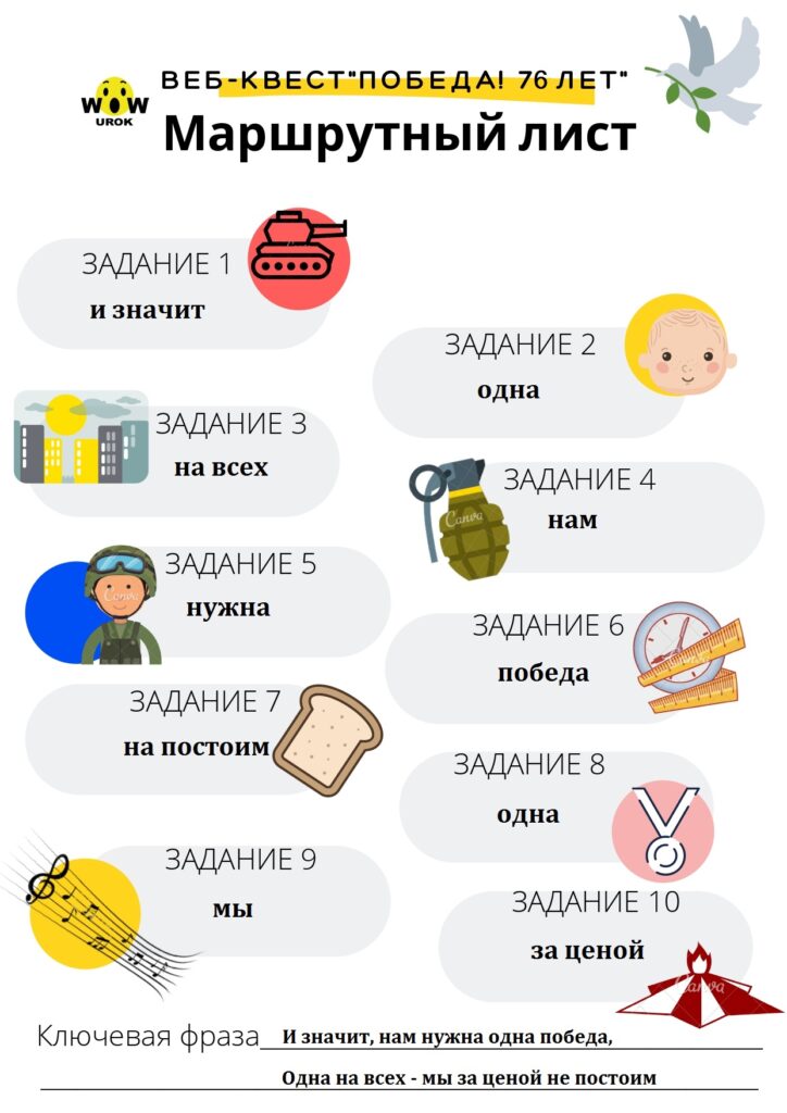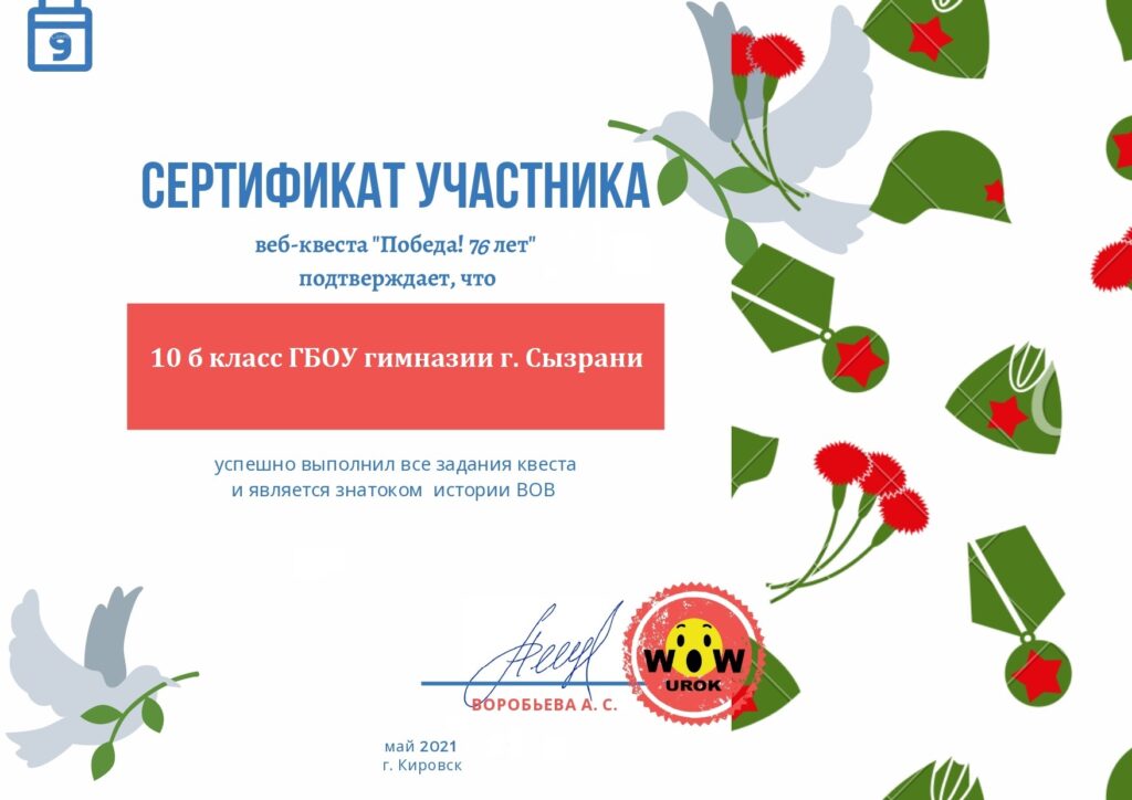 Приближается 76-я годовщина Великой Победы. Пожалуй, в каждой семье есть своя история, связанная с войной, но все они объединены в одну – историю Великой Отечественной войны 1941-1945 годов. Наши воины прошли долгий путь к Победе. 7 мая, накануне великого праздника, учащиеся 10б класса прошли свой путь к победе, на котором, выполняя 10 увлекательных заданий, они вспоминали знаменательные даты, события, героев, оружие, награды и песни Великой Отечественной войны. В конце каждого пройденного этапа web-квеста «Победа! 76 лет» ребята получали кодовое словосочетание из зашифрованной итоговой фразы. В завершении испытаний участники занесли расшифрованный отрывок из песни о войне в итоговою форму и получили сертификат знатоков истории ВОВ.